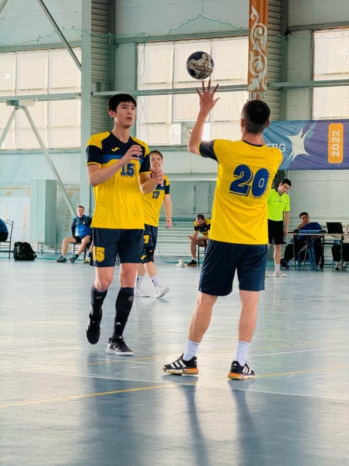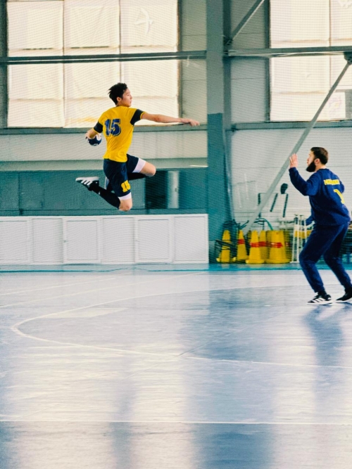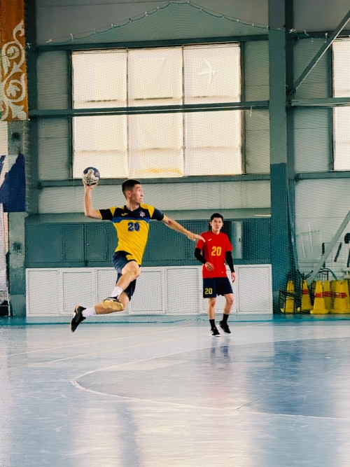 В команде играют только воспитанники школы гандбола Актюбинской области. На фото — наш гандболист Дәурен Тілек-қабыл в прыжке.