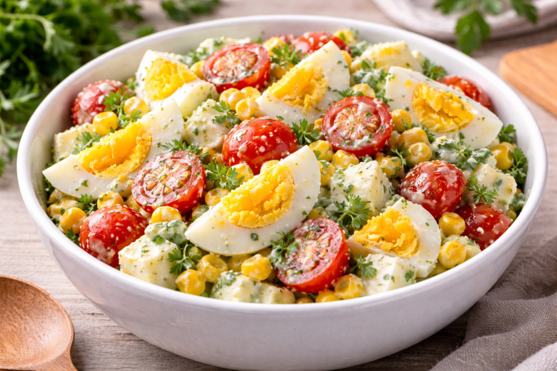 Яйца — 6 шт., сыр — 120–150 г, кукуруза консервированная — 150 г, помидоры черри — 200 г, густой йогурт — 3–4 ст. л., пучок зелени (лук, укроп, петрушка) — 1 шт., чеснок — 1–2 зубчика, соль — по вкусу.