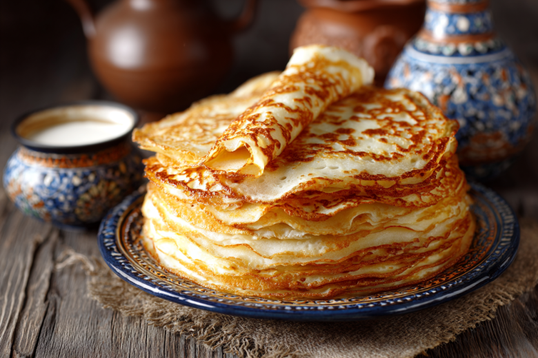 Для приготовления вам понадобится: 2 яйца, 2 ст. ложки сахара, щепотка соли, 500 мл молока, 200 г муки, 200 мл кипятка и 2 ст. ложки растительного масла. Яйца взбейте с сахаром и солью, влейте молоко и тщательно перемешайте. Постепенно всыпайте просеянную муку, размешивая до полного исчезновения комочков. Затем, непрерывно помешивая тесто, тонкой струйкой влейте крутой кипяток — оно сразу станет жидким и гладким. Добавьте масло, перемешайте и дайте тесту отдохнуть 10–15 минут. Разогретую сковороду слегка смажьте маслом и выпекайте блины на среднем огне по 30–40 секунд с каждой стороны до золотистого цвета. Складывайте стопкой, смазывая сливочным маслом.