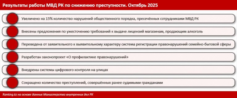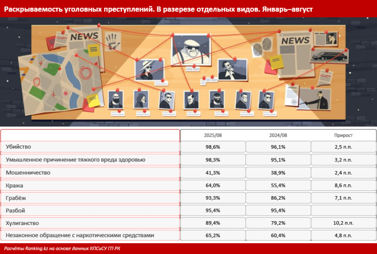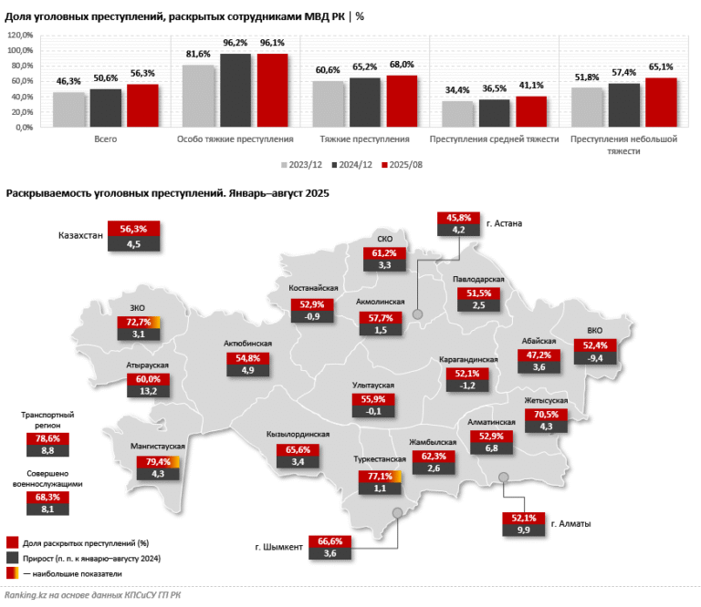 Сначала расскажем о втором. По данным Комитета правовой статистики и специальных учётов Генеральной прокуратуры (КПСиСУ ГП) РК, раскрываемость уголовных преступлений с 2023-го по январь–август текущего года увеличилась на 10 п. п., с 46,3% до 56,3%. Рост был постепенным. Наиболее выдающийся результат наблюдался в январе–августе 2025-го: за этот период раскрываемость преступлений выросла почти на 5 п. п.