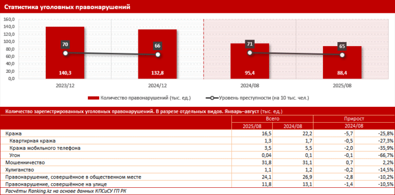 Вернёмся к статистике преступности. По крайней мере, согласно официальным данным КПСиСУ ГП РК, в течение последних нескольких лет в Казахстане наблюдается снижение общего уровня преступности. В 2023-м этот показатель составлял 70 случаев на 10 тыс. человек, в прошлом году — 66 случаев, за восемь месяцев 2025-го — уже 65 случаев. Если же сравнивать ситуацию с «докоронакризисным» периодом, разница будет колоссальной. В 2019 году уровень преступности достигал 131 случая на 10 тыс. человек. В абсолютных числах статистика тоже демонстрирует активное сокращение. В январе–августе текущего года в РК зарегистрировали 88,4 тыс. уголовных правонарушений — на 7,3% меньше, чем годом ранее.