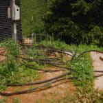 Тут же есть опора линии электропередач. Свисающие с неё провода небезопасно лежат на земле.