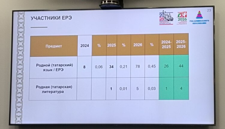 Так, согласно информации со слайда презентации, в текущем году единый республиканский экзамен по родному татарскому языку планируют сдавать 78 выпускников 11-х классов, отметила Закирова. В прошлом году было 34. Родную татарскую литературу будут сдавать 4 школьника.