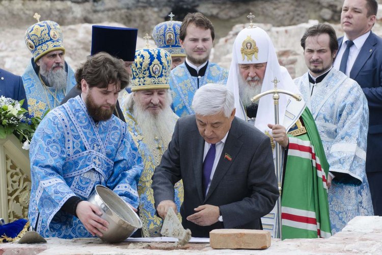 Закладка камня в основание храма Казанской иконы Божией Матери. Наблюдают патриарх Кирилл и митрополит Феофан. (Фото: «БИЗНЕС Online»)