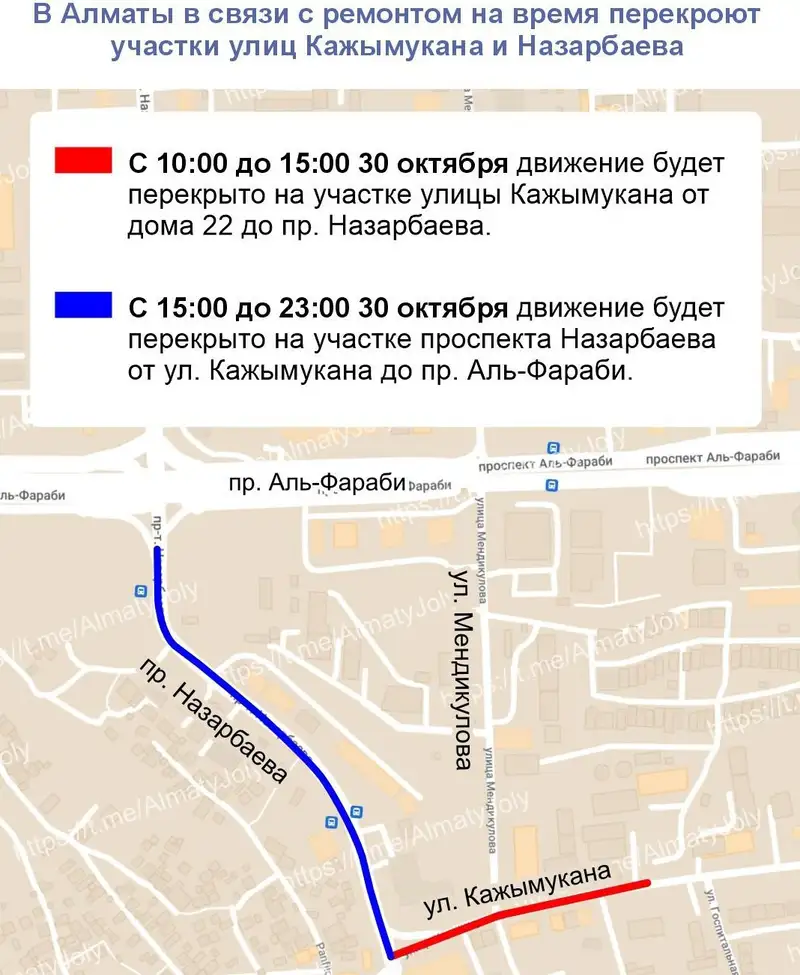 С 15.00 до 23.00 30 октября движение будет перекрыто на участке проспекта Назарбаева от ул. Кажымукана до пр. аль-Фараби. Объезд будет обеспечен по ул. Кажымукана, Мендикулова и пр. Достык.