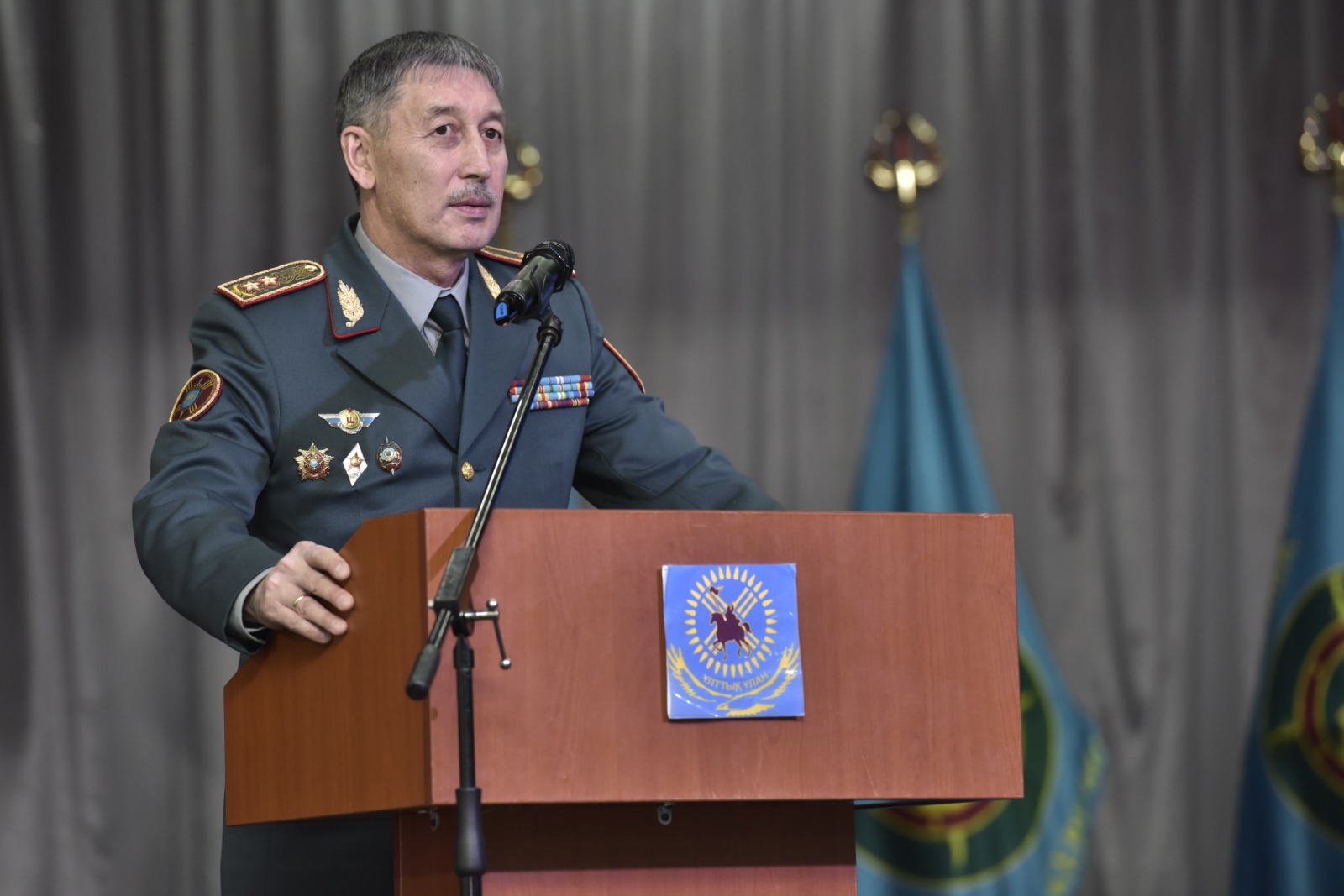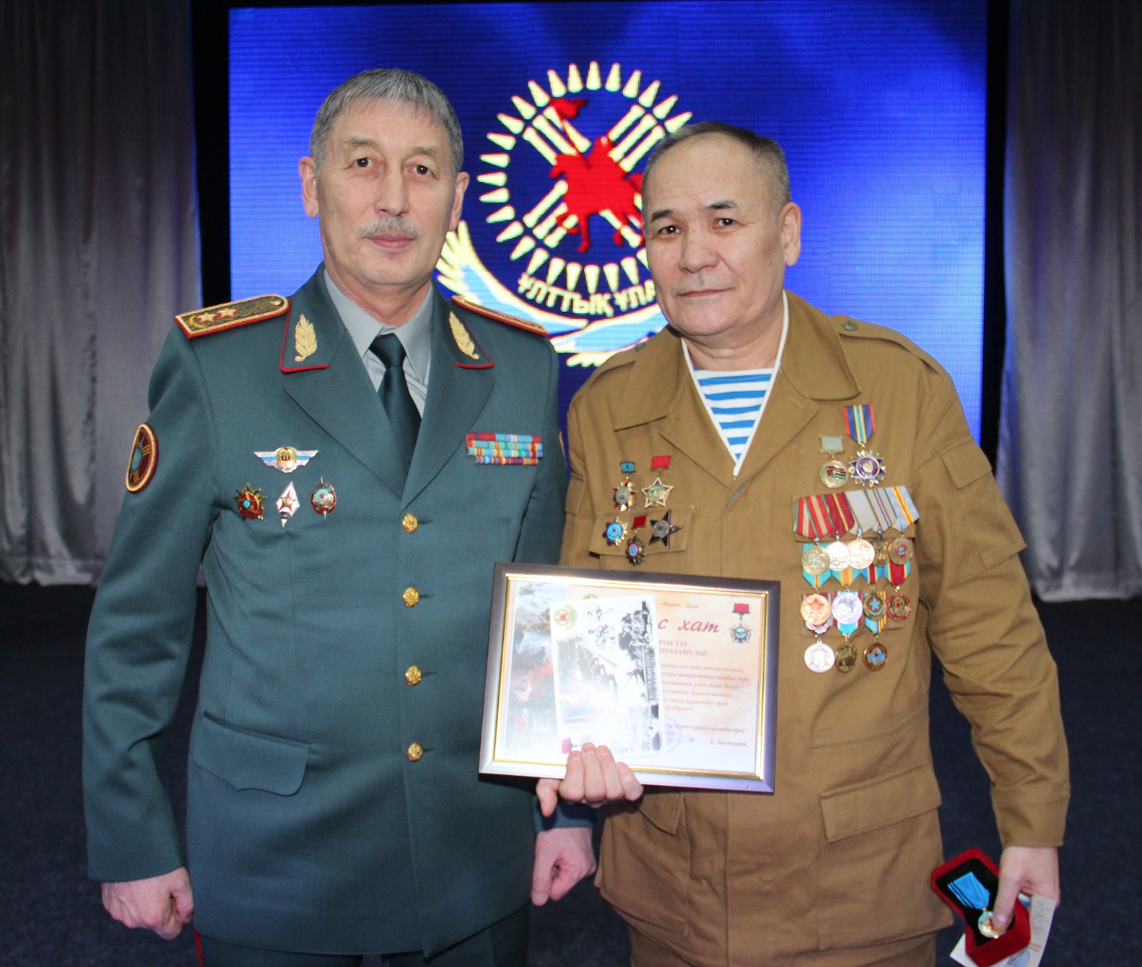 Сегодня мы отмечаем 35-летие очень знаменательного события. Это День памяти воинов-интернационалистов. В эту памятную дату по всей стране и в странах Содружества соберутся те, кто выполнял свой интернациональный долг «по ту сторону реки», и вспомнят всех своих боевых товарищей – и живых и павших. Подвиги «афганцев» не только внесены в их послужные списки и отмечены государственными и правительственными наградами. Они вошли в летопись республики и её Вооруженных сил, других войск и воинских формирований. Сегодня в Национальной гвардии числится 71 ветеран, выполнявший различные задачи в составе ограниченного контингента. В этом зале, вместе с нами присутствуют воины-афганцы, которые и сейчас продолжают проходить воинскую службу и конечно же, наши уважаемые ветераны воины-интернационалисты, выполнявшие различные задачи в составе ограниченного контингента. Нынешнему поколению есть на кого равняться и с кого брать пример. Эстафету мужества, начатую отцами, поддержанную их сыновьями, достойно несут сегодня их внуки. Пользуясь случаем, хочу пожелать всем ветеранам афганской войны, членам их семей крепкого здоровья, семейного благополучия, новых ратных и трудовых свершений на благо процветания нашей Родины – Республики Казахстан. Генерал-лейтенант Еркин Ботаканов