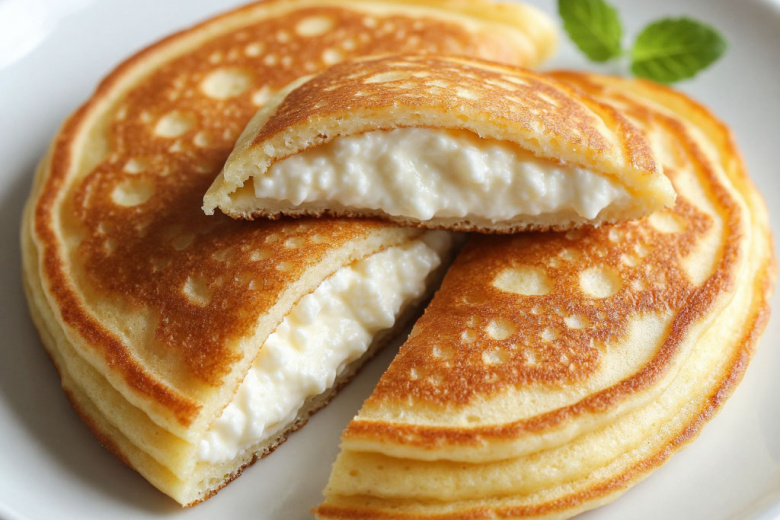 Эти блинчики-полумесяцы с творогом — гениально простое и невероятно вкусное блюдо, которое готовится прямо на сковороде без лишних хлопот. Их необычность в том, что не нужно возиться с конвертиками и трубочками: кладу творожную начинку на одну половинку блина, накрываю второй — и аппетитный полумесяц готов. Пара минут обжарки с двух сторон, и можно снимать с плиты. Получается обалденная вкуснятина: нежный, чуть сладковатый творог с ванилью в обрамлении тонкого, эластичного блина с хрустящими золотистыми краями. Творог внутри слегка плавится, становясь ещё нежнее, а снаружи — аппетитная румяная корочка. Такие полумесяцы идеальны для завтрака или полдника, они исчезают со стола мгновенно, и дети просят добавки.